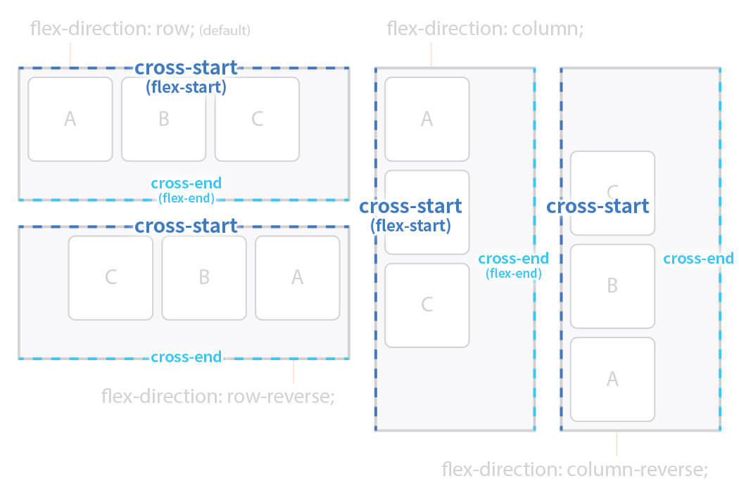 (flex-direction:row 일 때는 위쪽, :column 일 때는 왼쪽에 맞춰 정렬)