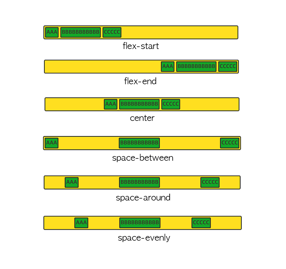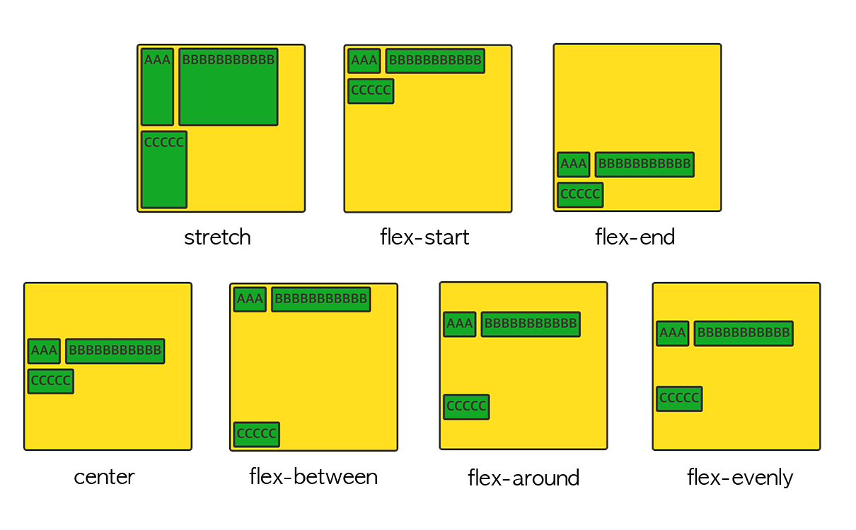 (flex-direction:row 일 때는 왼쪽, :column 일 때는 위쪽에 맞춰 정렬)