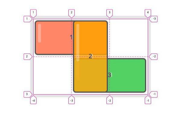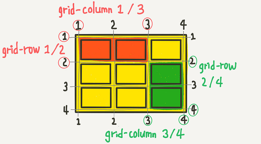 그리드 컨테이너의 그리드 라인 번호를 이용하여 row 와 column 의 영역을 지정하면 됨