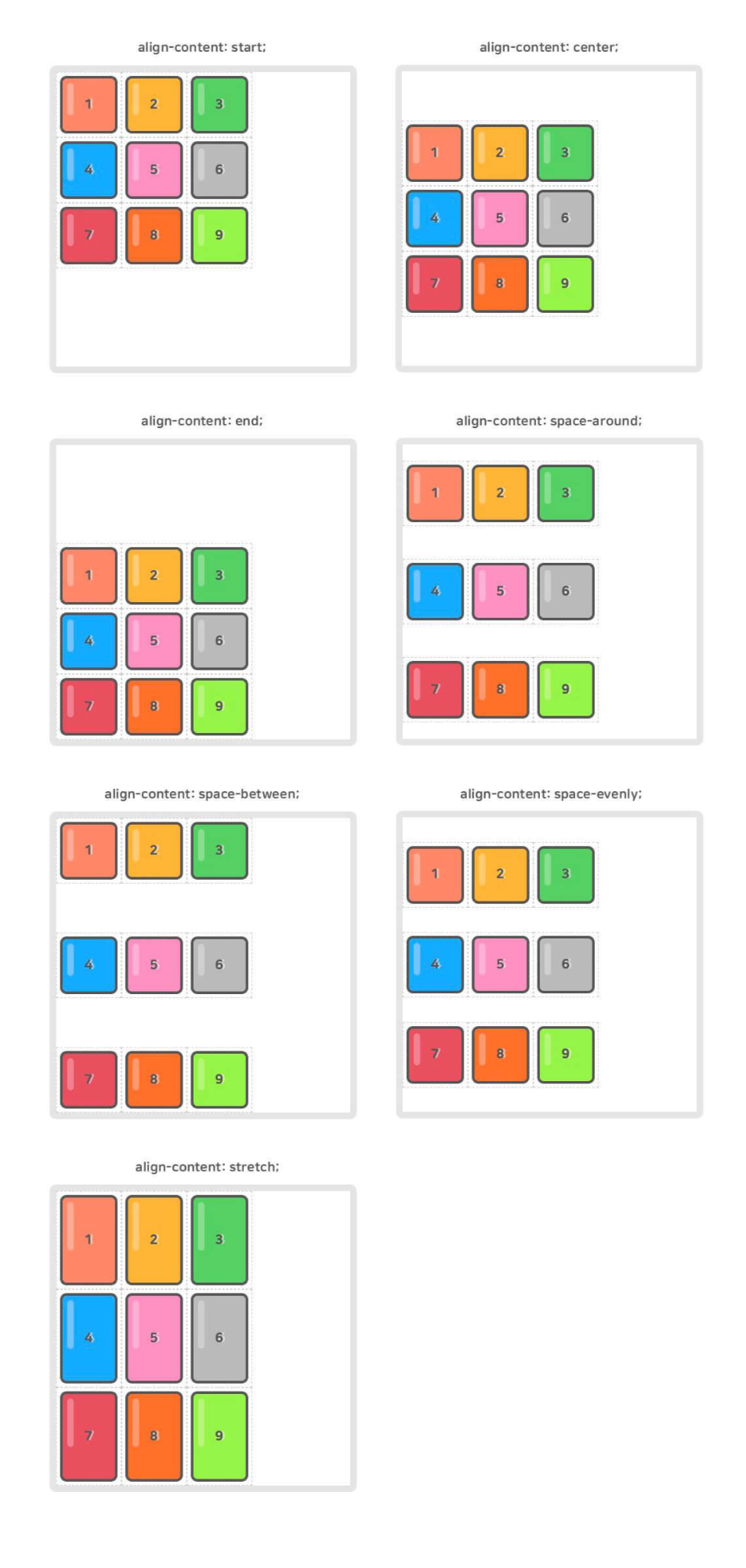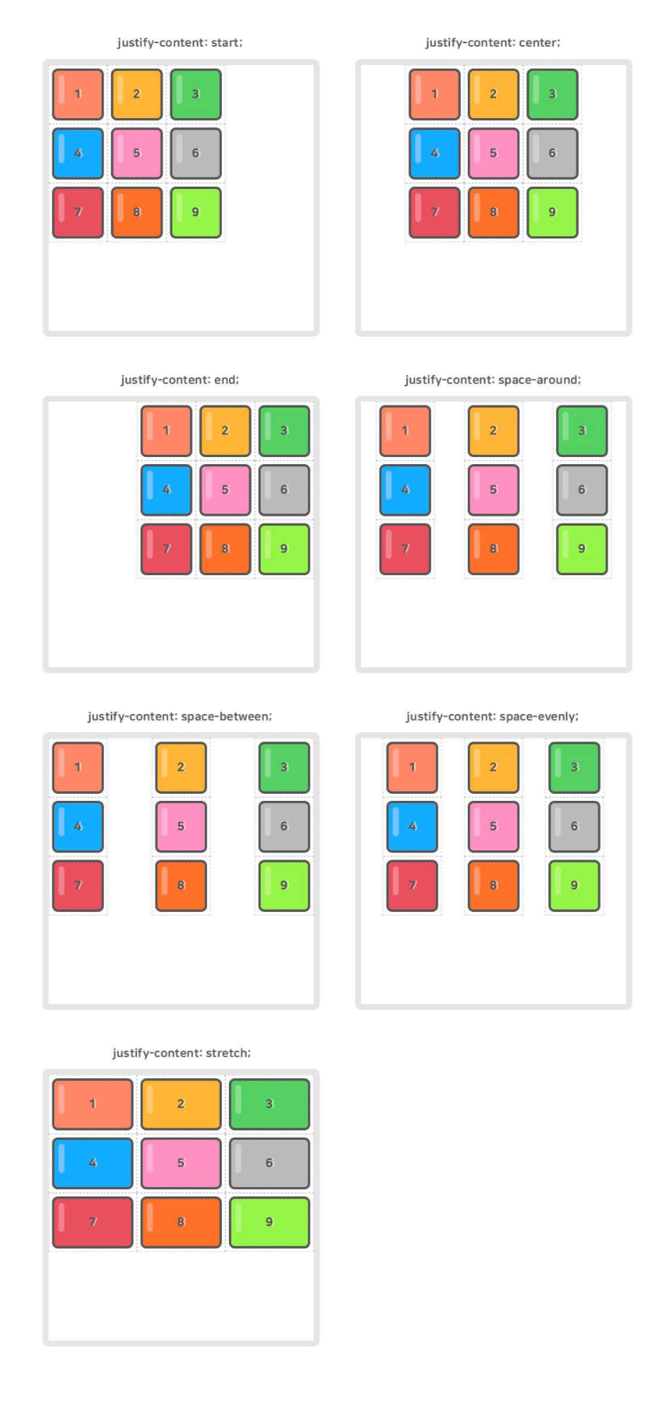 space-between : 첫 행을 시작점에, 끝 행을 끝점에 놓고 나머지 고르게 나누어 배치