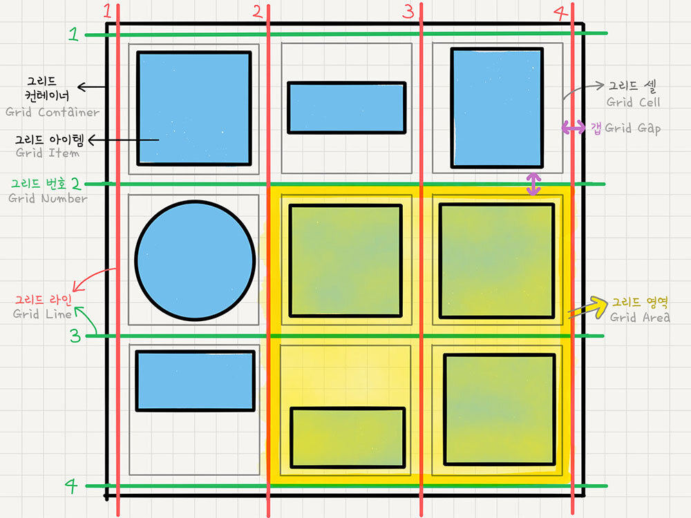 (div 같은 실제 html 태그 요소는 그리드 아이템, 이 아이템이 들어가는 가상의 칸이 그리드 셀)