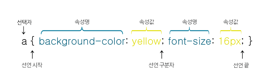 선택자 { 속성 : 속성값; 속성 : 속성값 }